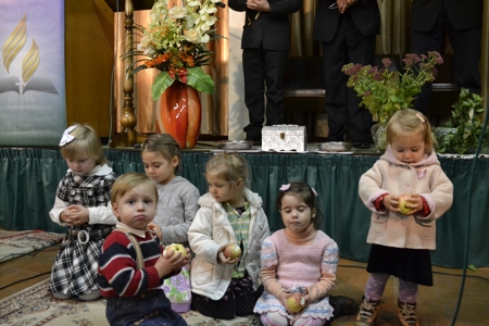 В благодарение за Его заботу, любовь и милость к нам, были принесены богатые плоды земли, которыми Бог наделил нас. Была украшена сценами различными фруктами, овощами, ягодами и бобовыми. После программы, все члены церкви со всеми гостями были приглашены за братский стол. Все продукты, которые были принесены в Дом Божий в тот же вечер были собраны и отвезены в детский дом в Вадулуй Воды под названием "Сurcubel" . Благодарим всех кто разделил с нами этот прекрасный праздник благодарения.
